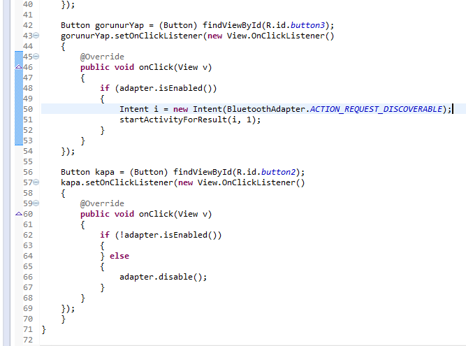 kusura bakmayın rahatsız ediyorum projem varda bluetooth açma kapamayı yapmaya çalışıyorum.Suan 4.0 ıcecreamsandwich de kodları yazdım ama sürekli hata veriyor ve ctrl+ shift+ o çalışmıyor.