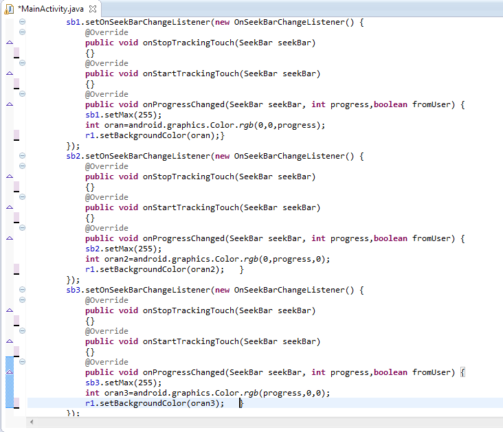 Nesne tanımladıktan sonra şimdi Listener tanımlayalım. Her nesne için bir Listener tanımlayacağız. Bunun için SeekBar için kullanılan aşağıdaki Listener’ı kullanacağız.