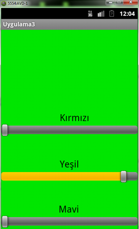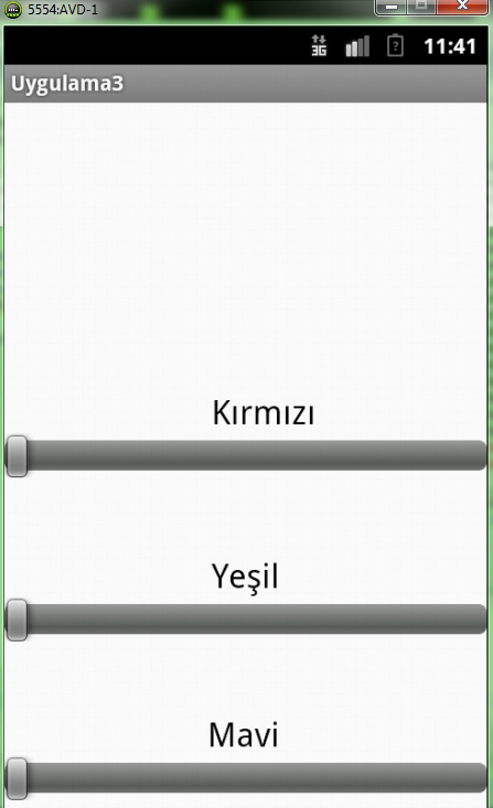 Bir uygulama üzerinde anlatalım. 3 adet SeekBar ekleyelim. Bunları oynattıkça ekranımızın arkaplanının rengi değişsin. 3 SeekBar da farklı renklerin değişimini sağlasın.