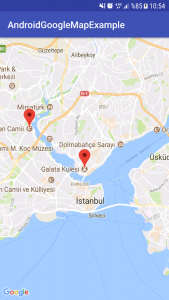 MainActivity.java dosyamızda ise basit bir harita tanımladık ve 2 adet marker ekledik.