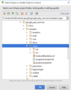 Bunları incelemek isterseniz sol üst köşeden File -> Close Project tıkladıktan sonra çıkan pencereden Import Project veya hiç Close demeden File -> New -> Import Project seçeneğine tıklayıp aşağıdaki gibi Sdk’nın kurulu olduğu dizinden /extras/google/google_play_services/samples/maps seçip ilerleyebilirsiniz.