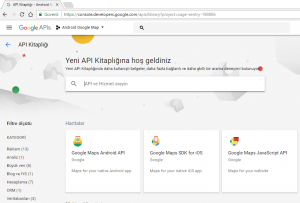 Projeyi Oluşturduk. Şimdi Google Maps API’yi etkinleştirelim. Bunun için aynı ekranda soldaki menüden API’ler ve Hizmetler -> Kitaplık butonuna tıklayalım.