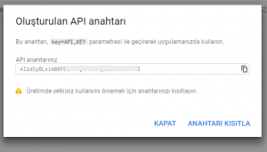 API anahtarını aldık. Anahtarı Kısıtla butonuna tıklayarak, sadece bizim projemizden bu API’ye erişebilmek için kısıtlama yapmamız gerekecek. Çünkü Google Maps API’nin bir kullanım kotası vardır ve API Key’i ele geçirenler API’yi kendi uygulamalarında kullanarak kotayı tüketebilir.