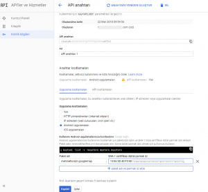 Şimdi anahtarı kısıtlayacağız yani başkasının kullanmasını engelleyeceğiz diyebiliriz. Uygulamamızın Paket Adı ve Fingerprint bilgilerimizle beraber satır bazında ekleme yapmamız gerekecek. Aşağıda son halini ekledim. “Uygulama kısıtlamaları” kısmını “Android Uygulamaları” olarak seçmeliyiz. En alt kısma ise çalıştığımız her bilgisayar için yeni bir satır eklemeliyiz. Ben bu bilgisayara ait SHA-1 sertifikası ekledim. Aynı API Key ile başka bir projede çalışmak isterseniz de başka bir paket adı ve aynı SHA-1 sertifikasını eklemeniz gerekir.