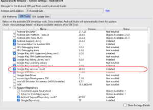 Proje oluştu fakat Google Maps kullanabilmek için Google Play Services‘i yüklemek ya da son sürüme güncellemek gerekiyor.