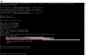 keytool -list -v -keystore C:\Users\mkirazli\.android\debug.keystore |