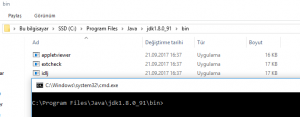 Diğer yolu ise komut satırından(cmd.exe) bulmaktır. Bunun için Java programının olduğu klasördeki bin dizinine gidiniz. Bendeki bu dizin şu şekilde