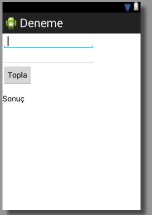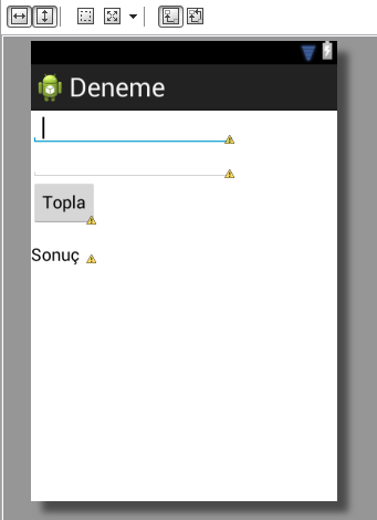 Burada sadece 4 satırı değiştirdik. 1 numaralı satırda edittext için inputType özelliğini kullandık. Değer olarak da “string/boş” verdik. Başına da @ karakterini koyuyoruz. Buradaki boş, strings.xml’de tanıttığımız değişkendir. Değeri de “” şeklindeki boş bir metindir. 2 numaralı satır için de aynısını verdik. 3 numarada buton için text özelliği ile butonun üzerinde yazan yazıyı değiştirdik. 4.satırda da textview yani sonucu gösterecek aracımızın text özelliğine, “@string/sonucumuz” parametresini verdik. Bu parametrenin değeri ne peki? Bunu zaten strings.xml’de vermiştik. Şimdi sayfamıza tekrar bakalım ve sarı üçgen ya da sarı ünlemin kalktığını görelim.