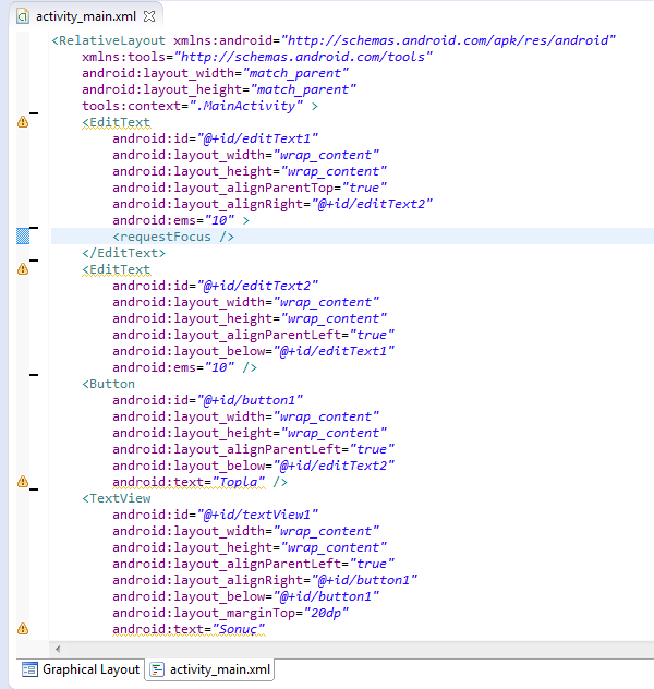 Uygulamamızda girilen 2 değeri toplayarak textview üzerinde göstereceğiz. Şimdi ilk olarak bu hataları giderelim. Biz bu kontrollerin adlandırmasını hep properties panelinden yaptık. Fakat şimdi başka yerden yapacağız.