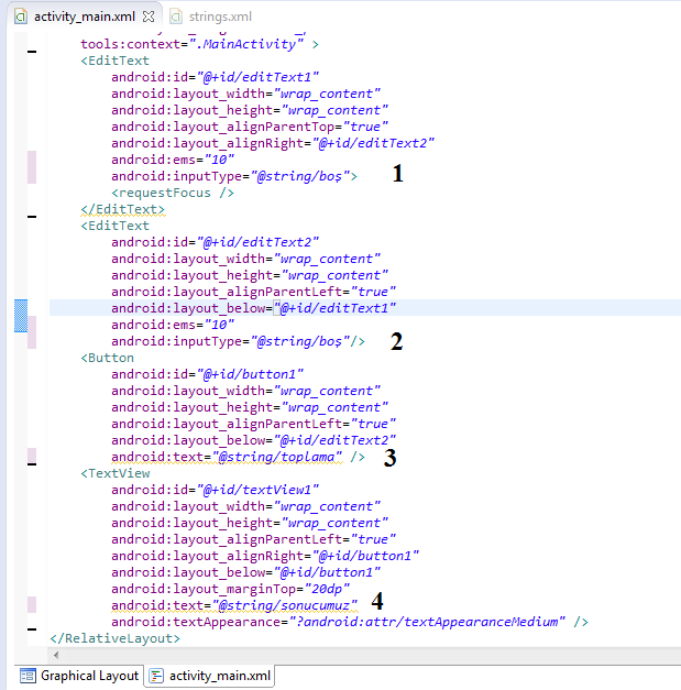 Burada örnek üzerinden gidelim. Mesela sayfamızda 1 tane textview var. Bunun text kısmını properties panelinden ayarladığımız için, bu textview’in name özelliği, “Sonuç” adını almıştır. Fakat biz bunu doğrudan değil de strings.xml’de hazırladığımız değişkenler ile belirleyeceğiz. Strings.xml’de “sonucumuz” adında bir string tanımlamıştık. Değeri de Topla‘ydı. Şimdi biz text kısmına, bu “sonucumuz” adındaki stringi vereceğiz. Diğer kontrollerin text kısımlarını da aynı şekilde strings.xml’deki stringler ile belirleyeceğiz. Xml sayfamızın son kısmı şu şekilde olacaktır.